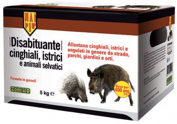 Mai Più Disabituante cinghiali, istrici e animali selvatici è un prodotto formulato in modo da emanare gradualmente nel tempo odori che svolgono una triplice azione: 1) creano un istintivo allarme di pericolo, 2) diffondono aromi repulsivi, 3) creano una sensazione di disagio e paura. Mai Più Disabituante svolge pertanto una forte azione contro Cinghiali e ungulati in genere, tramite una barriera olfattiva che riesce a proteggere le zone trattate dalla loro presenza. È particolarmente indicato per l’uso vicino alle strade, parchi, giardini, aree coltive, ecc. Il prodotto rispetta l’ambiente e gli animali.