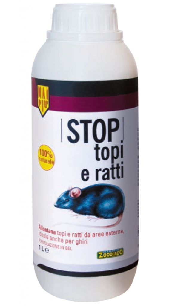 Mai Più STOP Topi e Ratti gel allontana topi e ratti da aree esterne. Grazie alla sua speciale formula composta da essenze aromatiche naturali attive è in grado di creare una vera e propria barriera olfattiva. Non sostituisce i classici rimedi presenti in commercio pensati per eliminare i ratti ma è la soluzione ideale quando non si possono o vogliono utilizzare sostanze velenose. Il suo scopo è unicamente quello di tenere lontano dall’area trattata topi e ratti senza essere dannoso per persone, bambini, gli stessi topi, l’ambiente ed altri animali. Prodotto ECOCOMPATIBILE non provoca danni alla vegetazione e/o alle falde acquifere.