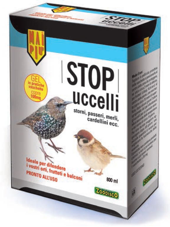 Mai Più STOP Uccelli Gel in vaschetta è un formulato completamente naturale ideale per difendere i vostri orti, frutteti e balconi dai volatili in genere, soprattutto storni, merli, passeri, cardellini ecc. Grazie alla particolare formula, contenente essenze naturali che risultano sgradevoli a questa tipologia di uccelli, riuscirete ad allontanarli in maniera del tutto innocua. Il prodotto non contiene prodotti chimici, non è pericoloso per l’uomo e gli esseri animali.