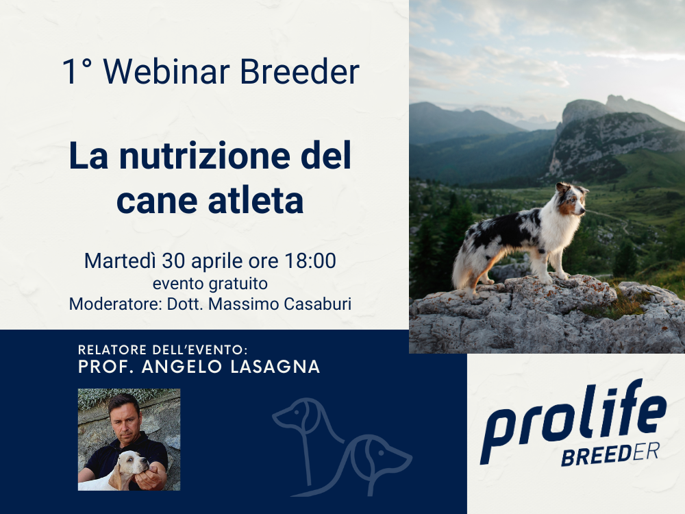 Prolife, leader nel settore della nutrizione animale, è lieta di annunciare il primo webinar dedicato agli allevatori: "La nutrizione del cane atleta". Il webinar si terrà martedì 30 aprile alle ore 18:00 e sarà tenuto dal Prof. Angelo Lasagna, esperto di nutrizione animale.