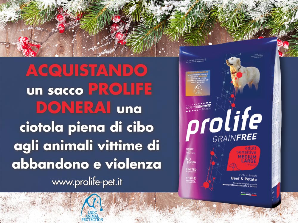 Acquista una confezione da 10 kg o 12 kg della linea Prolife Dog per donare una ciotola piena di cibo agli animali vittime di abbandono.