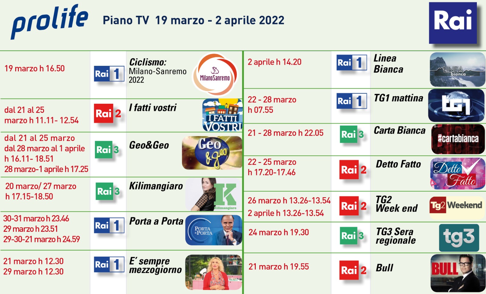 Al via la nuova campagna pubblicitaria "Prolife for life", in onda sulle reti RAI a partire da sabato 19 marzo con una pianificazione che spazia tra i principali programmi del palinsesto, tra intrattenimento, informazione e serie: tra questi Porta a Porta e Carta Bianca per la fascia serale, I fatti vostri e la Clerici con E’ sempre mezzogiorno, nell’intrattenimento della mattina di Rai 2 e RAI 1, ma anche Geo & Geo, Detto Fatto, condotto da Bianca Guaccero e Kilimangiaro nel pomeriggio delle tre reti ammiraglie.