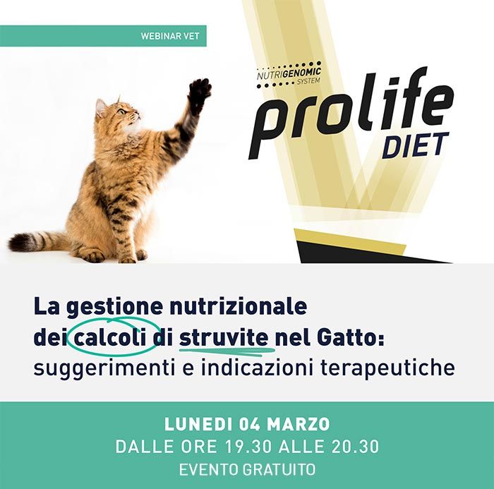 28 febbraio 2024 - L'attenzione degli specialisti in medicina veterinaria si rivolge con crescente interesse alla gestione nutrizionale della urolitiasi da struvite nei felini. In questo contesto, Prolife è lieta di annunciare il suo sostegno come sponsor al webinar gratuito "La Gestione Nutrizionale dei Calcoli di Struvite nel Gatto: Suggerimenti e Indicazioni Terapeutiche", in programma per il 04 marzo 2024 dalle 19:30 alle 20:30, organizzato da Edra Spa.